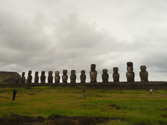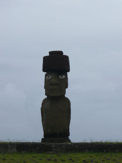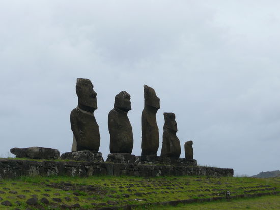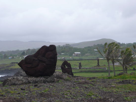 da der himmel stark nach regen aussah beschlossen wir mit unserer regenjacke richtung ahu tahai zu laufen und uns die nur 10 min entfernte moai staette anzusehen. diese staette muss traumhaft sein bei sonnenuntergang denn sie liegt direkt am meer. es war aber auch am tag traumhaft diese riesigen statuen zu bewundern. sie sind wirklich sehr eindruecklich und man fragt sich was sie wohl zu bedeuten haben.