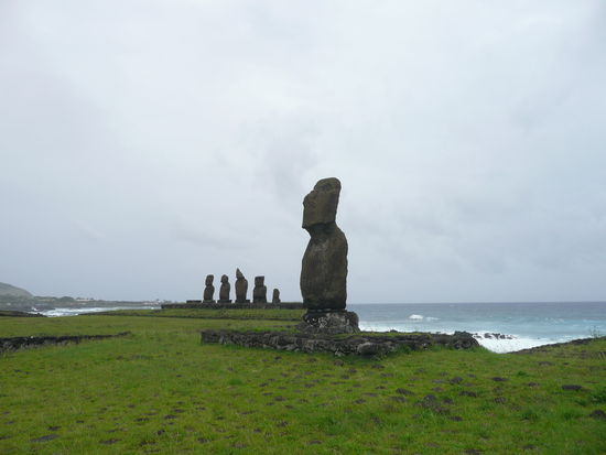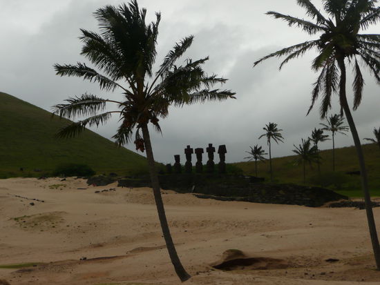 unser letzter stopp auf der tour war der anakena beach. anakena ist der einzige sandstrand von rapa nui und ist umgeben von palmen die von tahiti hergebracht wurden. der sand ist strahlend weiss und das wasser hat eine saphirblaue farbe. leider war uns bei diesem wetter ueberhaupt nicht zum baden zu mute. die bucht von anakena hat auch eine symbolische bedeutung. hier landete einst der mytenumwobene koenig hotu matua. die staette die direkt am strand liegt ist die ahu nau nau und weist 7 moai auf. fuenf davon sind unglaublich gut erhalten, man koennte meinen sie sind nicht echt... sind sie aber. sie sind so gut erhalten, da sie bis 1979 vom sand verdeckt waren. die wissenschaftler fanden auch in diesem jahr heraus, dass die moai nicht blind waren sondern augen aus weissen korallen hatten.