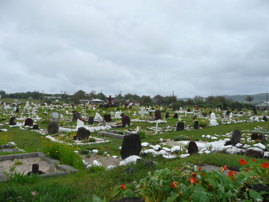 nachdem wir uns von der schoenheit der moai loesen konnten, spazierten wir durch wind und regen vorbei an weitern statuen und dem friedhof in richtung hanga roa. hanga roa ist eine stressfreie, ruhige stadt und besteht aus gerade mal 2 geteerten strassen. die strassen sind gesaeumt von restaurants und souvenierlaeden. nachdem wir fuer das abendessen und das fruehstueck am naechsten tag eingekauft haben und durch ein paar souvenierlaeden geschlendert sind, machten wir uns mit unserem neuergatterten regenschirm nach hause. wir kochten uns eine gemuesesuppe und gingen frueh schlafen.