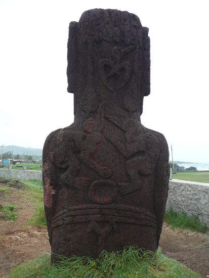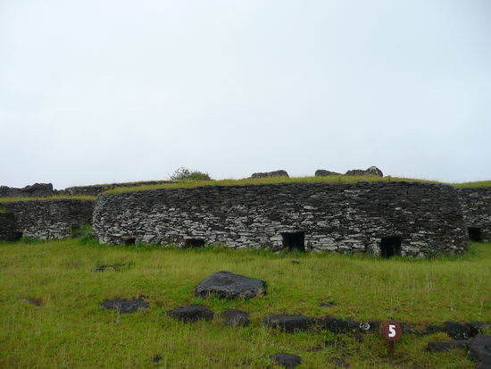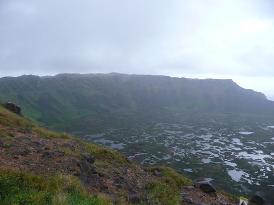 als wir am morgen erwachten regnete es in stroemen und der himmel sah nicht gerade nach aufhellung aus. wir gingen erst mal duschen und machten uns das fruehstueck. jaa und es regnete immer noch. wir beschlossen noch etwas zu warten und als es dann um 12:00 uhr aufhoerte, machten wir und der kueste entlang richtung vulkan. die aufhellung dauerte jedoch gerade mal 10 minuten bevor es wieder anfing zu schuetten. mit dem regenschirm in der hand bewunderten wir die steilen klippen die ins meer fallen und wanderten langsam auf der verdammt rutschigen, schlammigen strassen dem krater entgegen. mit klitschnassen hosen, da der regen dank dem wind schraeg auf uns zu raste, kamen wir beim aussichtspunkt auf den kratersee an. wow dies ist trotz neben und regen ein wunderschoener anblick! leider sind halt die fotos etwas dunkel geworden. weiter ging es richtung orongo. es regnete immer noch . der eintritt um das zeremoniendorf zu besuchen kostet 10$. das ticket ist jedoch auch noch fuer den zweiten vulkan der insel rano raraku gueltig. es war wirklich beeindruckend anzusehen wie dieses dorf direkt am abgrund des kraters gebaut wurde.