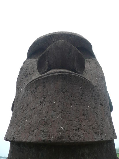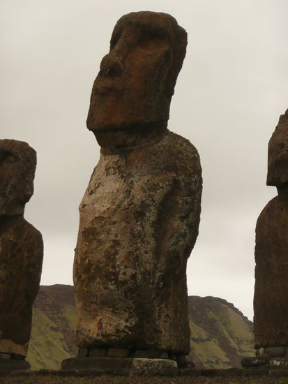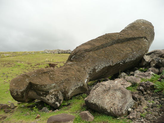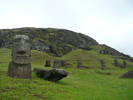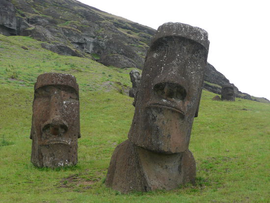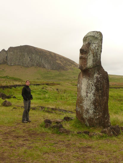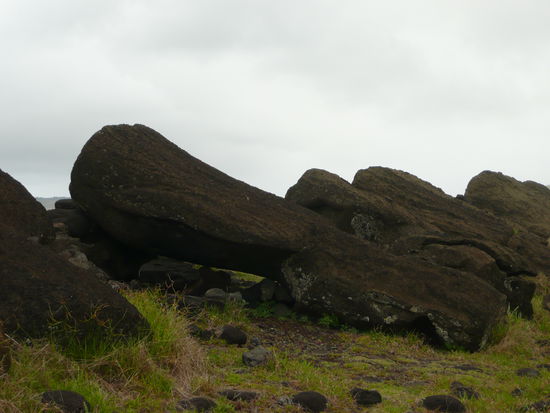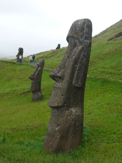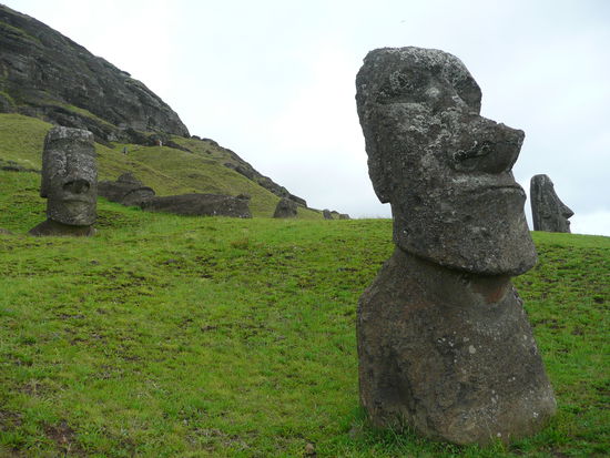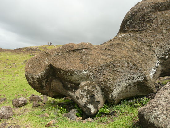 danach ging es weiter nach rano raraku, der geburtsstaette saemtlicher moai statuen. keine andere stelle der insel wirkt so raetselhaft wie der rano raraku. in den steinbruechen meisselten die vorfahren aus dem harten vulkantuff die gewaltigen statuen. davon stehen auf diesem erloschenen vulkan ueber 300 stueck. der legende nach werden diese moai irgendwann zum leben erwachen und losmarschieren. viele statuen stehen aufrecht, sind aber bis zur brust oder zum kinn in der erde vergraben, sodass oft nur noch der kopf zu sehen ist. hier liegt auch der groesste moai der jemals gemeisselt wurde. er hat eine laenge von 21m. In diesem wald voller koepfe umherzugehen war unbeschreiblich.