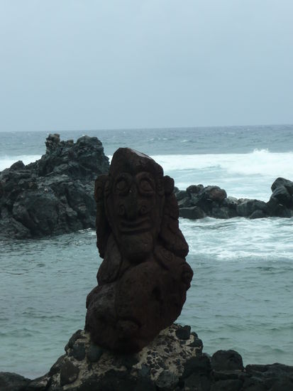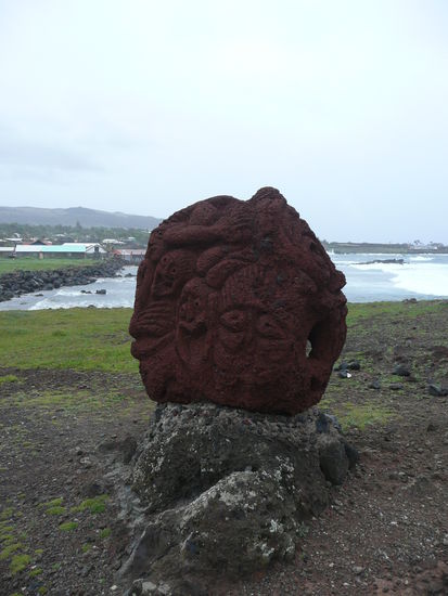 an unserm letzten tag auf der wunderschoenen insel rapa nui wollten wir doch noch einen roller mieten und standen zeitig auf. der morgen begruesste uns jedoch wieder mit heftigem regen und somit starten wir mit einem leckeren cappucchino in einem restaurant direkt am meer. der himmel sah nicht gerade nach einer besserung aus und somit liessen wir uns zeit. erst am nachmittag als es sich schon nicht mehr lohnte einen roller zu mieten war das wetter zum ersten mal einbisschen freundlicher. jedoch von sonne immer noch keine spur. somit verbrachten wir unser letzter tag mit kaffee trinken, internet, wieder kaffee trinken und einen salat mit scampis und jakobsmuscheln essen.