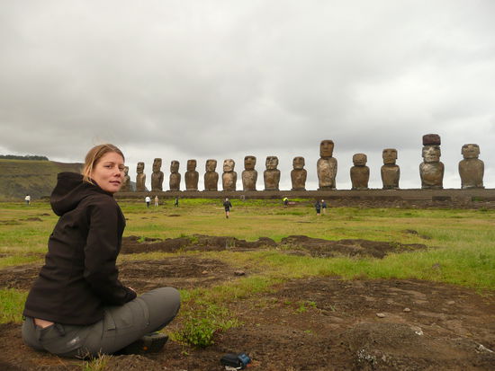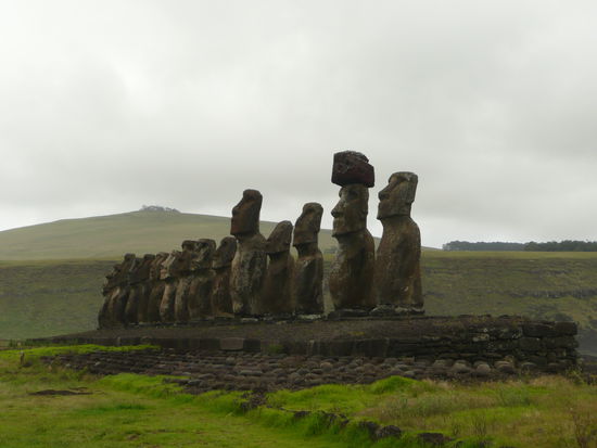 weiter ging die fahrt in richtung tongariki wo wir durch gruene wiesen uebersaet von lavasteinen fuhren. ueberall grasten grosse herden von pferden und der wind pfiff ums auto. ahu tongariki ist eine der schoensten staetten ueberhaupt. sie besteht aus 15 stehenden moai und hat eine traumhafte lage direkt am meer. 1960 stuerzten hier saemtliche moai von ihrer plattform wegen eines erdbeben und dem darauffolgenden tsunami. einige abgerissene kopfaufsaetze landeten tief im landesinneren, nur einer wurde zurueckgebracht. der fuenfte moai ist einer der groessten den sie gefunden haben und weist eine hoehe von 10 m auf. es war wunderschoen einfach nur da zu sitzten und sie zu bewundern.
