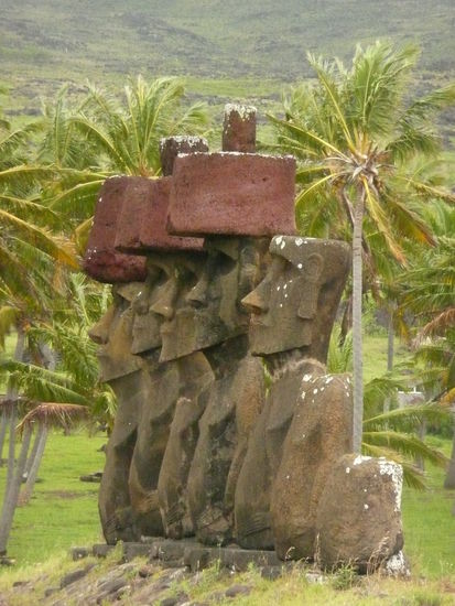 als die vorfahren noch auf dieser insel wohnten, holzten sie den gesamten baumbestand nieder. man weiss bis heute noch nicht so genau wieso. darauf folgte hungersnot da sie kein holz mehr hatten um sich boote zum fischen zu bauen. es gab 2 gruppen von menschen die auf rapa nui lebten. die langohren und die kurzohren. da die kurzohren die langohren nicht mochten, begannen sie diese wegen der hungersnot zu essen.