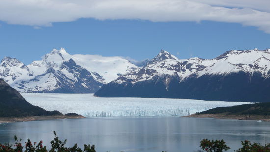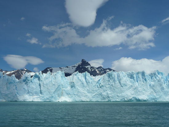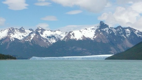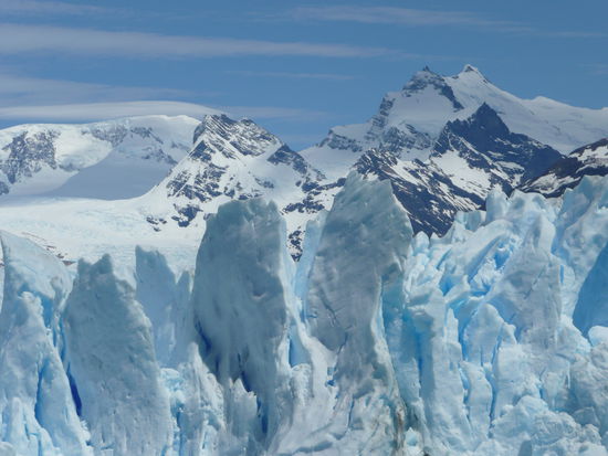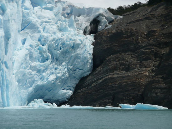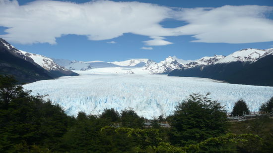 der letzte gletscher den wir besuchten ist der beruehmte perito moreno. der perito moreno gletscher ist der einzige gletscher der jeden tag ueber einen meter waechst und daher kann man hier taeglich groessere abbrueche bewundern. dieser unglaublich beeindruckende gletscher hat eine laenge von 30 km und weist eine oberflaeche von 195 quadrat km auf. die front ist 4 bis 5 km lang und die hoehe betraegt 60 m. der perito moreno gletscher teilt sich in zwei eisstroeme auf da die halbinsel magallanes buchstaeblich im weg steht und somit den fluss des gletschers behindert. durch den staendigen vorstoss bilden sich daher oft eisbruecken.
