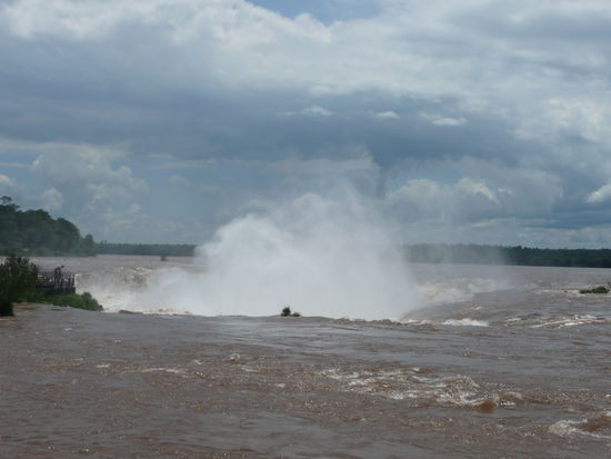 im nationalpark angekommen habe ich mich auch gleich in den zug gesetzt und bin zum halbkreisfoermigen garganta del diablo gefahren. ueber laufstege die ueber den fluss fuehren erreicht man den teufelsschlund. man sieht den wassernebel schon von weitem und je naeher man kommt desto lauter wird das tobende geraeusch des wassers. es ist unglaublich! man kann sich den teufelsschlund so vorstellen. man laeuft ueber einen relativ ruhigen fluss und ploetzlich steht man vor einem riesigen loch wo das wasser runter stuerzt. einfach wahnsinn! auf dem weg dorthin wird man von hunderten von schmetterlingen verfolgt die so richtig laestig werden koennen . sie setzen sich auf deine haare, deinen rucksack, auf die arme einfach ueberall hin. ich glaube ich war ein besonders beliebtes opfer .