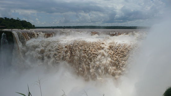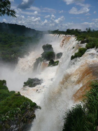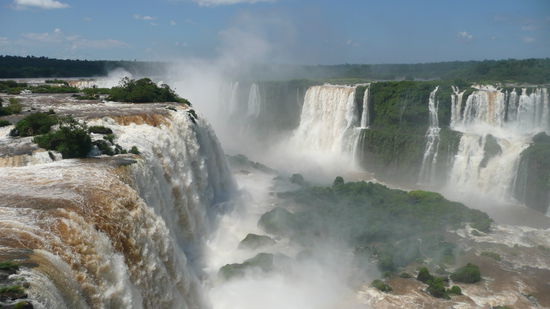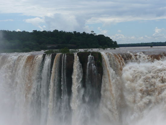 die geologische entstehungsgeschichte der faelle klingt dagegen etwas nuechterner. im suedlichen brasilien fliesst der rio iguazu ueber ein basaltplateau, das abrupt vor dem zusammenfluss mit dem parana endet. unmittelbar vor der kante teilt sich das wasser in etliche kanaele, die fuer die diversen cataratas verantwortlich sind.