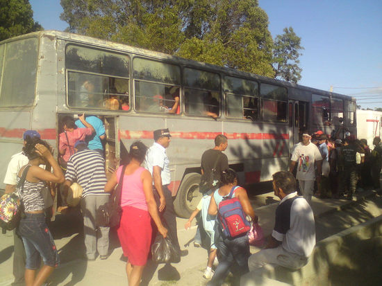 Für europäische Verhältnisse ist der Bus eigentlich schon überfüllt, hier in Cuba gilt die Devise "Was nicht passt, wird passend gemacht". Letztendlich ist der Bürgersteig leer als sich der Transport in Bewegung setzt..........und wir bleiben staunend zurück.