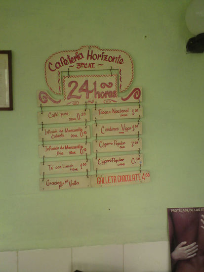 Ein Paradies für coffeinjunkies ist Cuba allemal. Hier die Preisliste des dealers unseres Vertrauens in Santa Clara. Oben links der einfache Cafe für ca 15 cent....