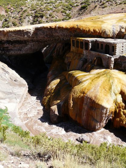 Da wir von der Stadt am ersten Tag genug gesehen hatten, haben wir einen Ganztagesausflug in die Anden (High Mountain Tour) gemacht. Der Trip war grossartig, und wir haben den Tag genossen. Etwa 150 km von Mendoza entfernt liegt der hoechste Berg ausserhalb des Himalayas, der Aconcagua. Die Fahrt erst durch kleinere Berge und dann durch die Giganten der Anden war sehr beeindruckend. In der Umgebung sind viele weitere Sechstausender zu finden. Wir sind zum Aconcagua NP gefahren und dort auf 3.000 m zu einem Aussichtspunkt gewandert. Der Berg ist gigantisch, und wir haben an seinem Fuss beschlossen, ihn eines Tages zu besteigen. Anschliessend ging es ueber eine sehr kurvenreiche Schotterpiste auf 4.200 m. Auf dem Pass ist die Grenze zu Chile und eine Jesusstatue. Diese Statue wurde gebaut, als Argentinien und Chile kurz vor einem Krieg miteinander standen, um beide Voelker zu beschwichtigen. Der Pass ist heute nur noch eine Touristenattraktion, da ein Tunnel gebaut wurde. Dies hat auch dazu gefuuhrt, dass die Stadt am Fusse des Passes jetzt nur noch eine Geisterstadt ist. An jedem Hang sind faszinierende Farbspiele zu beobachten. Letzer Halt war die Puente del Inca, eine natuerlich entstandene Bruecke, unter der ein Fluss verlaeuft. Dort gibt es warme Quellen, die die Bruecke und die Felsen durch den hohen Schwefelgehalt des Wassers gelb gefaerbt haben. Um die Entstehung der Bruecke ranken viele Sagen und Legenden. Die plausibelste Variante ist, dass sie nach der Eiszeit durch das Schmelzen der Gletscher entstanden ist.