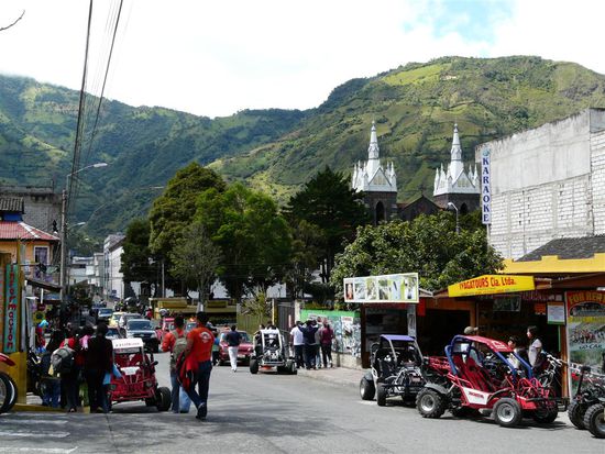 Baños de Agua Santa kurz: Baños (spanisch für Bäder) ist eine Stadt mit 18.000 Einwohnern. Die Stadt liegt am Fuße des sehr aktiven Vulkans Tungurahua (5016 m über dem Meeresspiegel). Ende 1999 wurde die Stadt aufgrund dringender Empfehlungen vor allem ausländischer Vulkanexperten komplett evakuiert und geschlossen. Nachdem der Ausbruch den Ort wie all die Jahrhunderte zuvor verschont und nur eine dicke Ascheschicht hinterlassen hatte, erzwangen die Einwohner nach einigen Monaten gegen den Widerstand der Behörden und des Militärs ihre Rückkehr in ihren Ort. Bei den damit verbundenen Unruhen gab es einen Toten. Die Stadt kann also nicht ohne und auch nicht mit dem Vulkan leben. Vor einer Fahrt nach Baños sollte man sich dringend ueber die aktuelle Situation vor Ort erkundigen.