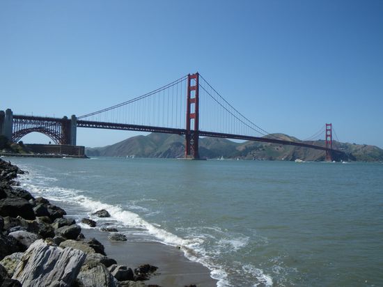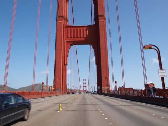 Die Golden Gate Bridge ist das Wahrzeichen San Franciscos. Sie wurde 1937 eroeffnet und sollte eigentlich grau gestrichen werden. Die Rostschutzfarbe gefiel aber allen so gut, dass man sich entschied, die Bruecke nicht zu streichen. Beim Bau kamen 11 Menschen ums Leben. Geplant waren 35 Tote. Dementsprechend galt dies als Erfolg. Nach der Eroeffnung ist die Bruecke zu einem der weltweit beliebtesten Plaetze fuer den Freitod geworden. 1250 Menschen sind bisher von ihr aus in den Tod gesprungen.