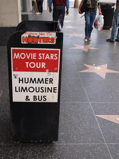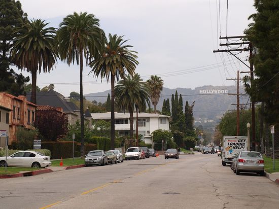 Nach einem Lauf am Strand von Santa Monica besuchten wir am naechsten Morgen die Wahrzeichen Hollywoods. Das "Holllywood Sign" in den Bergen ueber der Stadt war schwer zu finden. Nachdem wir uns munter durchgefragt hatten, haben wir dann doch die richtige Strasse gefunden. Zweites Ziel war der "Walk of Fame". Auf diesem Gehweg sind ueber 2.000 Platten mit Sternen fuer Stars eingelassen. Mit den Sternen werden lebende wie auch verstorbene Prominente geehrt, die eine wichtige Rolle vor allem in der amerikanischen Unterhaltungsindustrie spielten oder noch spielen.