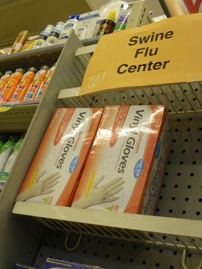 Viel neues zum Thema Schweinegrippe gibt es nicht zu berichten. Wir sind weiterhin wohlauf. Einige Drogeriemaerkte versuchen Geld mit der Angst der Leute zu machen und verkaufen Plastikhandschuhe und Mundschutz auf Sonderstaendern.