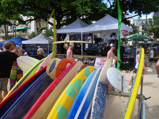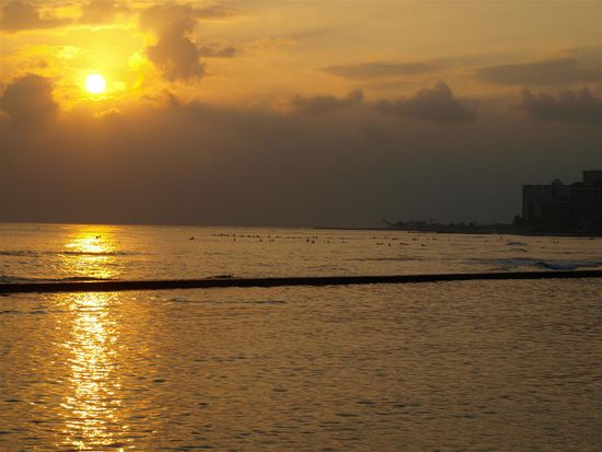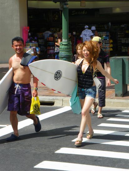 Abends haben wir uns im Ort umgesehen. Wir waren von der wahnsinnigen Anzahl von Geschaeften sehr beeindruckt. Eine Einkaufsmeile schliesst an die naechste an und zwischendurch findet man teure Restaurants und Fast Food. Bevoelkert wird Waikiki in der Mehrzahl durch Japaner und Amerikaner auf Kurzurlaub. Beide Gruppen kommen zum Einkaufen und auch zum Heiraten. Ausserdem trifft man vereinzelt Touristen aus aller Welt und Surfer. Die Atmosphaere hat uns stark an Disneyworld erinnert. Alles ist sehr kuenstlich und scheinbar perfekt. Paradiesisch sind hier in Waikiki hoechstens die vielen Einkaufsmoeglichkeiten.