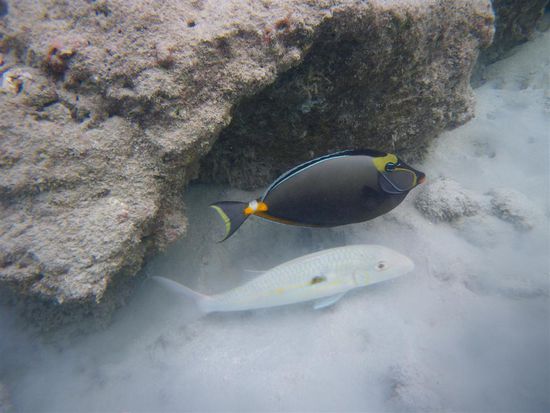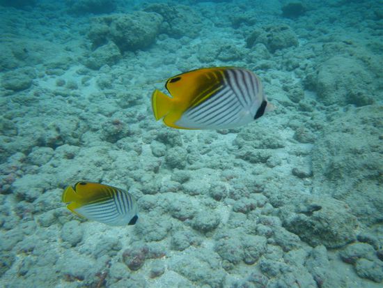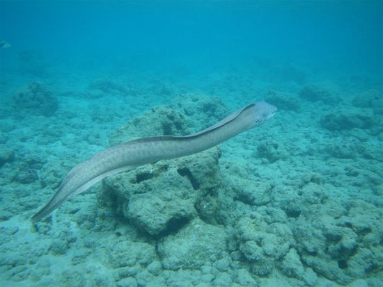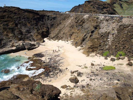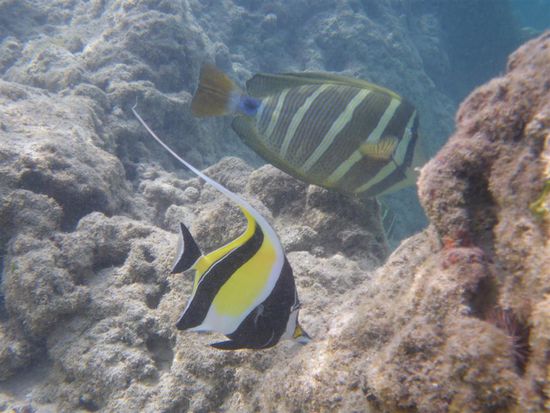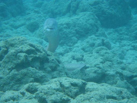 Am letzten Tag haben wir uns ein Auto ausgeliehen und uns den Rest der Insel angesehen. Autofahren kann man auf Oahu super, da es viele Highways gibt. Erstes Ziel war die Hanauma Bay, das Schnorchelparadies der Insel. Den Strand durften wir erst betreten, nachdem wir uns ein 15-minuetiges Infovideo angesehen hatten. Dort lernten wir unter anderem, wie man die Schnorchelausruestung benutzt, dass man nicht auf Korallen treten darf, und dass es verboten ist, Fische anzufassen bzw. einzupacken. Wenn derartiges nicht ausdruecklich verboten ist, neigen vor allem japanische Touristen dazu, das ein oder andere auch lebendige Souvenir fuer die Hotelbadewanne mitzunehmen. Wir konnten so etwas in Asien schon mit eigenen Augen beobachten. Kein Scherz! Nachdem sich also alle im Klaren waren, was zu tun war, gingen wir endlich zum Strand. Es hat sich gelohnt. Es gab viele verschiedene Fische zu bestaunen. Joerg hat zum ersten Mal eine Muraene schwimmend ausserhalb ihrer Hoehle gesehen.