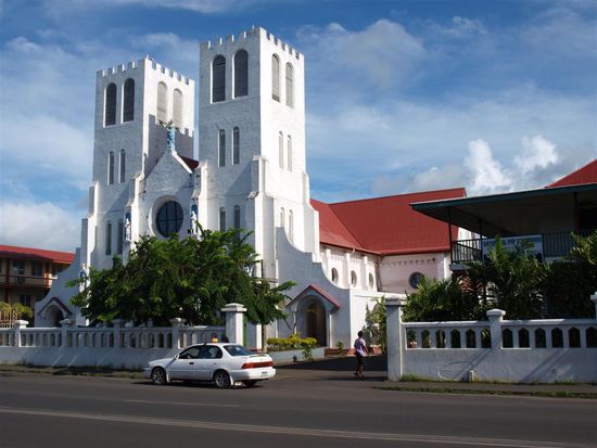 Die ersten Eindruecke von Samoa haben gleich gezeigt, dass wir mit der Wahl unseres Suedseereiseziels die richtige Wahl getroffen haben. Wir wollten eine andere Welt sehen und auf Samoa ist so ziemlich das gesamte Leben nicht im geringsten mit der westlichen Welt vergleichbar. Um die Hauptinsel fuehrt ein Rundkurs und zwei Strassen queren die Insel. Die Doerfer liegen direkt an der Strasse. Die meisten Samoaner leben in offenen Haeusern, die Falen genannt werden (ein paar Sauelen und ein Dach). Die Eltern werden direkt vor der Fale begraben. Je mehr Geld zur Verfuegung war, desto groesser das Grab. Jedes Dorf auf Samoa hat seinen eigenen Haeuptling und dieser regiert sein Dorf. Angehoerige des Dorfes, die einen Job haben, liefern ihr verdientes Geld jede Woche beim Haueptling ab. Alles kommt in die Gemeinschaftskasse und wird mit Vorliebe dazu verwendet neue Kirchen zu bauen. Fast jede bekannte Auspraegung der katholischen und evangelischen Kirche ist hier vertreten. Samoa hat 180.000 Einwohner und 1.000 Kirchen. Je groesser die Kirche, desto wichtiger das Dorf. Die Missionare haben hier ganze Arbeit geleistet und willige Einheimische vorgefunden. Aus alten Ueberlieferungen wussten sie, dass eines Tages eine neue Religion die Inseln erreichen wird. Sie haben ihre Religion aufgegeben und sich voll dem neuen Glauben gwidmet. Dieses sehr gemeinschaftliche Leben fuer die Kirche hat einen entscheidenden Nachteil. Die Samoaner sind nicht sonderlich motiviert zu arbeiten, da ihnen hoeherer Einsatz keinen Vorteil bringt. Dementsprechend ist die wirtschaftliche Entwicklung Samoas sehr ueberschaubar. Wirtschaftlich existiert Samoa hauptsaechlich durch Tourismus, Landwirtschaft (Kokosnuesse und Bananen) und Geldspenden von im Ausland lebenden Samoanern. Von letzteren gibt es sehr viele. Allein in Auckland leben annaehernd so viele Samoaner wie auf Samoa.