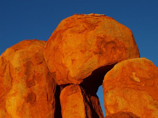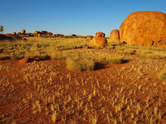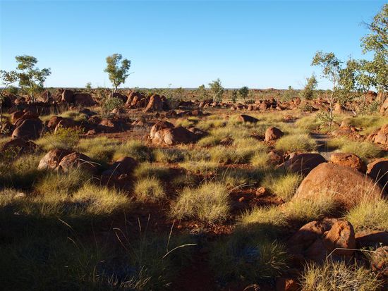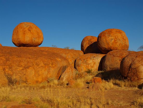 Anschliessend sind wir noch 400 km bis zu den Devil's Marbles gefahren. Die Devil's Marbles (Murmeln des Teufels) sind eine heilige Staette der Aborigines in der australischen Wueste. Bei den kugelfoermigen "Teufelsmurmeln" handelt sich um einige tausend Felsen aus Granit, die durch Verwitterung und Erosion entstanden sind.