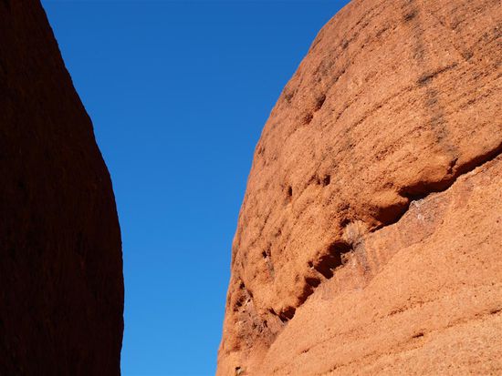 Die Kata Tjuta (die Olgas) sind eine Gruppe von 36 Inselbergen ca. 30 km vom Uluru entfernt. Der hoechste Fels ragt 564 m aus der Umgebung heraus (1069 m). Kata Tjuta bedeutet in der Anangu-Sprache viele Koepfe.