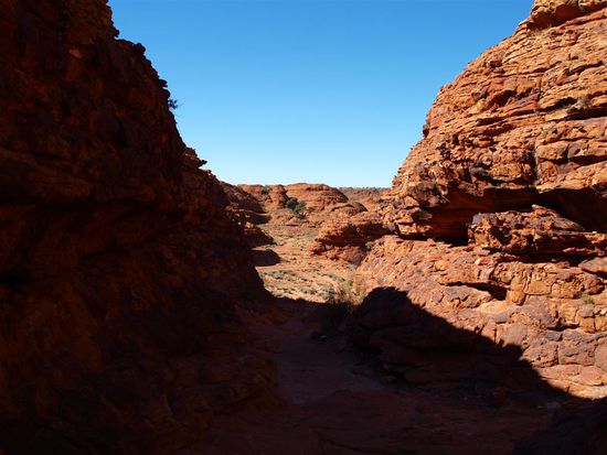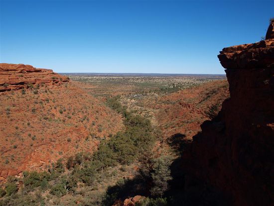 Dort angekommen sind wir auf dem "Canyon Rim Walk", einem dreistuendigen bzw. 6 km langen Rundweg gewandert. Dies war unsere schoenste Wanderung auf der bisherigen Reise. Saemtliche Wanderwege in Australien kann man uebrigens wesentlich schneller als angegeben bewaeltigen, auch wenn man sich viel Zeit laesst. In 2|3 der Zeit ist jeder Weg problemlos zu schaffen. Das einzig Nervige bei den Wanderungen im roten Zentrum waren die vielen Fliegen. Diese Biester versuchen einem, auf der Suche nach Feuchtigkeit, staendig und sehr zielstrebig in die Augen zu krabbeln. Erschreckt hat uns die Tatsache, dass die Hochsaison der Fliegen in der waermeren Jahreszeit liegt. Angeblich fliegen dann nicht zehn, sondern hunderte Fliegen um den Kopf herum.