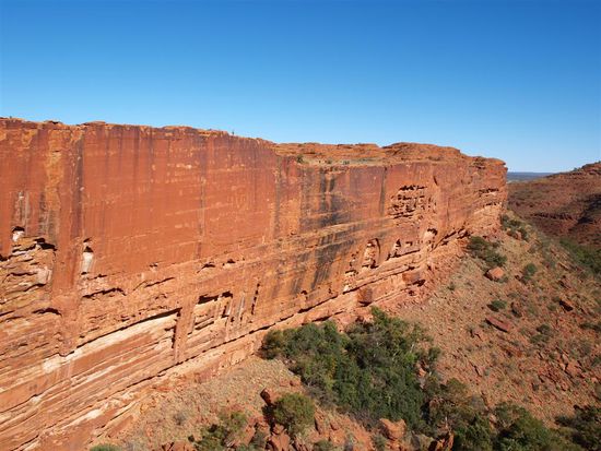Anschliessend fuhren wir zum Kings Canyon. Der Kings Canyon ist Teil des Watarrka-Nationalparks und liegt 323 km südwestlich von Alice Springs. Die Felswaende bestehen aus rotem und gelbem bis weissem Sandstein und sind teilweise über 300 m hoch.