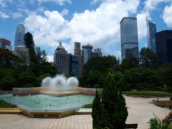 Am folgenden Tag sind wir mit der Faehre von Kowloon nach Central auf Hong Kong Island gefahren. Die neunminuetige Fahrt ist sehr empfehlenswert und billiger als die U-Bahn. Unsere ersten Eindruecke haben wir aus der Vogelperspektive auf uns wirken lassen. In Hong Kongs hoechstem Gebauede kann man per Fahrstuhl in den 55. Stock fahren und von dort die Aussicht geniessen. Wieder auf dem Boden angekommen, sind wir kreuz und quer durch viele Parks, kleine Gassen, Maerkte und Hochhaueser gelaufen. Eintritt ist in Hong Kong ein Fremdwort. Egal ob Park, Zoo oder die Aussichtspunkte, nie mussten wir etwas bezahlen. Es ist sehr ueberraschend, wie gruen diese riesige Stadt ist, ueberall laden kleine Oasen zum Verweilen ein.