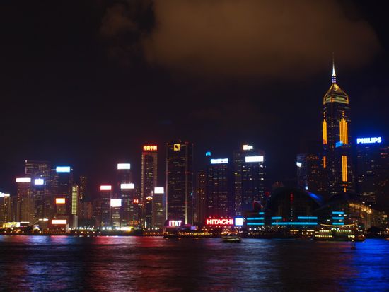 Abends genossen wir an der Tsim Sha Tsui Promenade die Symphonie der Lichter. Jeden Abend um acht Uhr werden dort zu klassicher Musik fuer zehn Minuten 36 Hochhauser auf Hong Kong Island in wechselndes Licht getaucht. Ein unvergesslicher Anblick, wenn die Massen weg sind kann man in aller Ruhe die Skyline auf sich wirken lassen.