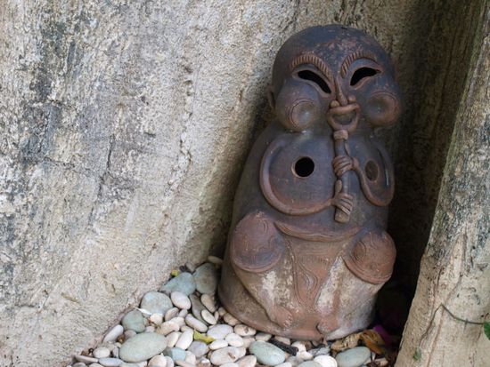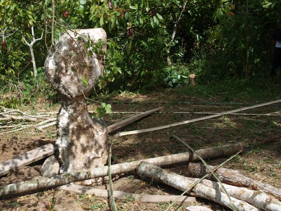 Diese Tau-Taus warten seit zwei Jahren gemeinsam mit den dazugehoerigen Leichen auf die tatsaechliche Beerdigung. Sie sind die letzten Gaeste ihrer Beerdigung, die bis aufs Begraben erledigt ist. Sie wollen nicht eher unter die Erde bzw. in den Fels, bevor nicht Hahnenkaempfe zu ihren Ehren stattgefunden haben. Die Sondergenehmigung der Regierung fehlt noch. Der Dorfchef meinte, dass das auch noch ein paar Jahre dauern kann. Damit die drei Jungs bis dahin nicht so allein sind, hat man das Tau-Tau ihrer vor 23 Jahren gestorbenen Mutter vom Grab dazugeholt.