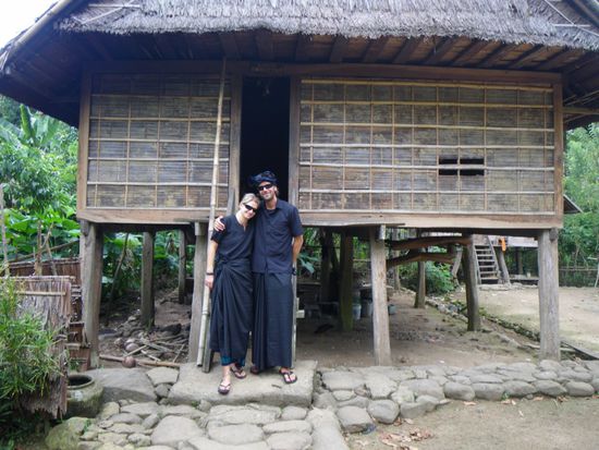 Das naechste Ziel war Sengkang. Auf dem Weg dorthin besuchten wir ein traditionelles Dorf. Bevor wir hinein durften, mussten wir uns schwarze Sarongs (Roecke), Hemden und Joerg sogar eine traditionelle Kopfbedeckung anziehen. In diesem Dorf wird jeglicher Fortschritt negiert. Die Bewohner leben ohne moderne Errungenschaften wie Autos, Mopeds und Strom in sehr traditionellen Huetten. Der Haeuptling wird nicht gewaehlt, sondern in einer Zeremonie aus mehren Anwaertern auserwaehlt. Magie und Aberglaube spielen dabei eine grosse Rolle. Wir hatten eine Audienz beim derzeitigen Chef und konnten ihm ein paar Fragen stellen und seine Huette begutachten.