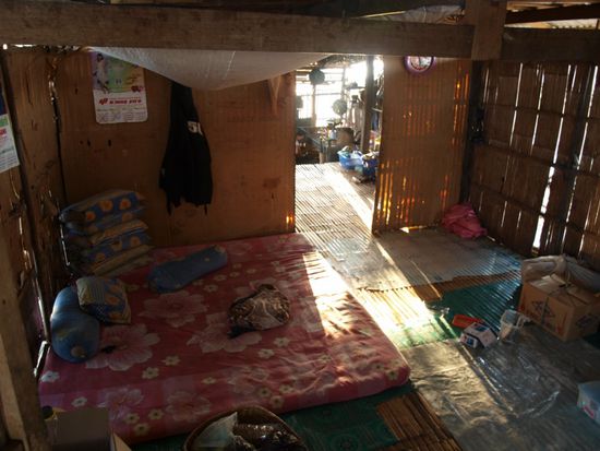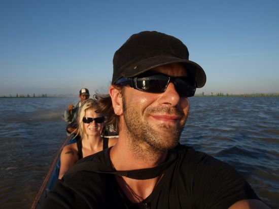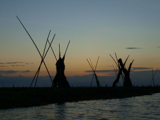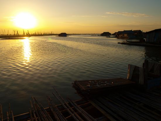 In Sengkang angekommen bestiegen wir sofort ein Boot und fuhren den Fluss hoch, um eine andere regionale Besonderheit zu sehen. Der Fluss fuehrte uns auf einen sehr grossen und sehr flachen See, auf dem Fischer auf schwimmenden Haeusern wohnen. Die Szenerie war sehr spektakulaer. Das Haus, das wir besuchten, war ca. 25 Quadratmeter gross und diente fuenf Personen als Schlafplatz, war Kueche, Huehnerstall, Minimarkt und Tankstelle. Die Bewohner waren sehr freundlich und luden uns direkt zu Tee und leckerem Kuchen ein. Nach einem wunderschoenen Sonnenuntergang auf dem See fuhren wir zurueck in den Ort.