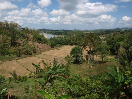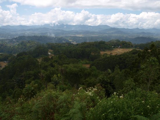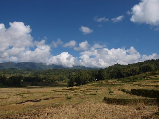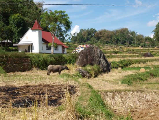 Am naechsten Morgen fuhren wir weiter nach Rantepao im Torajaland in den Bergen Sulawesis. Diese Gegend ist fuer ihre schoene Landschaft, die Architektur der Haeuser und die sehr speziellen Beerdigungszeremonien der Einheimischen bekannt. Im Gegensatz zu unseren bisherigen Zielen, die in muslimisch gepraegten Regionen lagen, ist dieser Teil Sulawesis christlich. Anstatt Moscheen sieht man viele Kirchen und auch Kopftuecher sind eher eine Seltenheit.