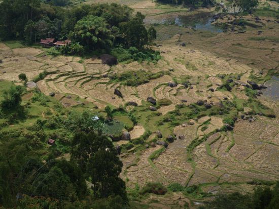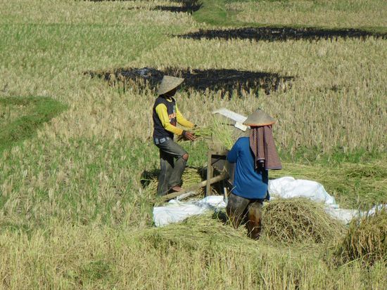 Wir haben in unseren Tagen im Torajaland verschiedenste Graeber, Doerfer, insgesamt fuenf Leichen (bzw. "ernsthaft Kranke") und viele Reisfelder gesehen. Die Leute bearbeiten die Felder noch komplett ohne Maschinen und jeder hilft bei der Arbeit auf dem Feld mit. Bei Wanderungen durch die Doerfer und Reisfelder konnten wir hautnah in diese sehr urspruengliche Welt mit freundlichen Einwohnern eintauchen. Stolz wurden uns die (noch lebenden Wasserbuefffel) praesentiert und mitgeteilt, was der Marktpreis des Tieres ist. Die Kinder rufen jeden Weissen "Belanda", was Hollaender auf indonesisch heisst.