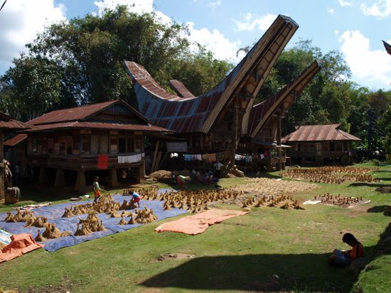 Ein weiteres Highlight sind die Haueser der Einheimischen. Sie sind Schiffen nachempfunden und sehr traditionell gebaut. Die Schiffsform dient als Gedenken an den Urvater der Einwohner, der mit dem Boot aus China kam und sich dann in den Huegeln des Torajalandes niederliess. Gegenueber von jedem traditionellen Haus steht ein Reisspeicher, der auch in dieser Form gebaut ist. Vor dem Haus werden die Hoerner von Wasserbueffeln praesentiert, die bei Beerdigungen von Familienmitgliedern geopfert wurden.