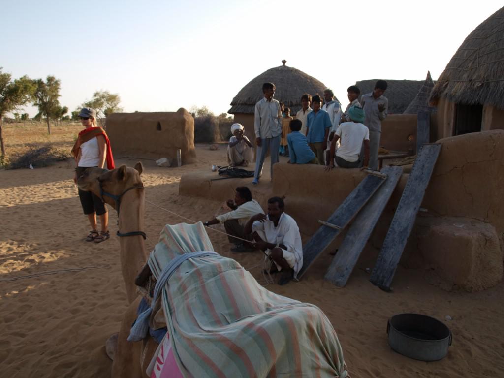 In Kakoo angekommen haben wir im Wohnzimmer des Organisators unserer Kamelsafari ein ausserordentlich leckeres Mittagessen erhalten und sind am spaeten Nachmittag mit Reitkamelen durchs Dorf und in die Wueste Thar geritten. Dort haben wir in den Duenen die Nacht unter freiem Himmel verbringen koennen. Der Anblick des Sternenhimmels war unvergesslich. Gratis war zudem noch jeweils ein schoener Sonnenaufgang und -untergang, Unterhaltung mit lokaler Musik und Abendessen und Fruehstueck in den Duenen. Nachts besuchte uns ein Fuchs und wir konnten aus naechster Naehe miterleben, was ein Kamel so die ganze Nacht ueber macht: schnauben, widerkaeuen, Loecher buddeln, dann reinlegen, um nur ein paar Beispiele zu geben. Das Reiten auf den Kamelen war einfacher, als wir es uns vorgestellt haben, lediglich beim Aufstehen und Hinsetzen des Kamels zum Auf- und Absteigen musste man aufpassen, nicht herunterkatapultiert zu werden.