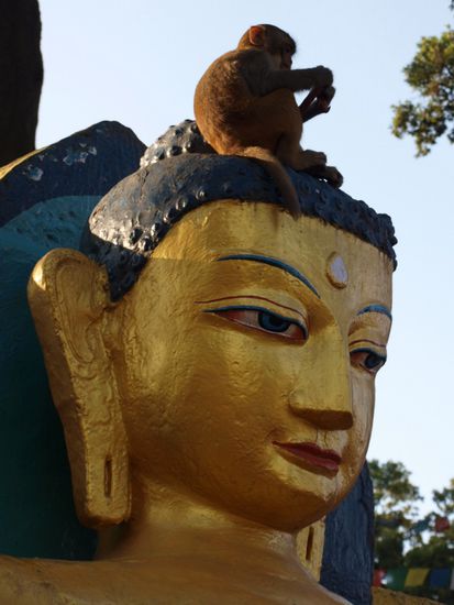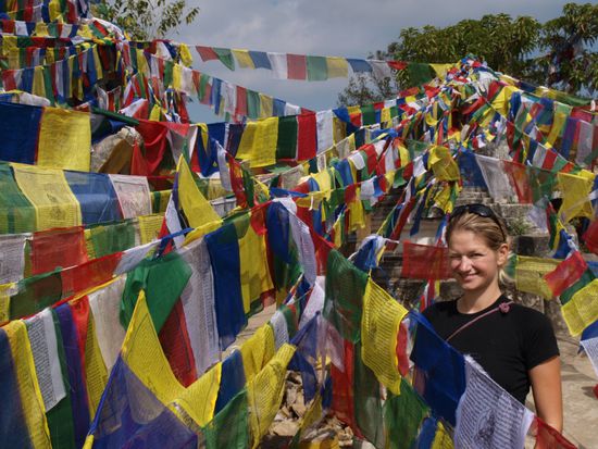 Nachmittags besuchten wir "Swayambhunath". Auf einem Berg ueber der Stadt steht dort ein buddhistischer Tempel (Stupa). Dieser wurde im 13. Jahrhundert erbaut und ist definitiv einen Besuch wert. Am Fuss der Stupa befinden sich Gebetsrollen, die alle mit dem heiligen Mantra "Om Mani Padme Hum" (heil dem Juwel im Lotus) bedruckt sind. Weitere Mantras stehen auf den unzaehligen Gebetsflaggen, die uns schon seit unserer Zeit in Pokhara permanent begleiten. Sie haengen an Tempeln, Haeusern, Bruecken und auf Bergen. Wir moegen diesen farbenfrohen und gleichzeitig spirituellen Anblick sehr.