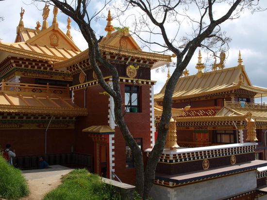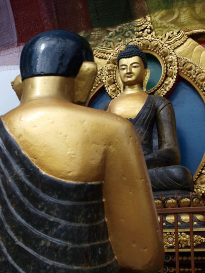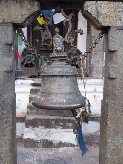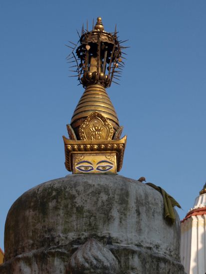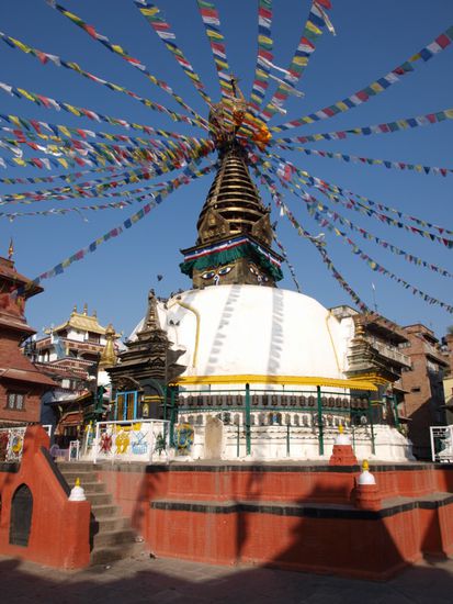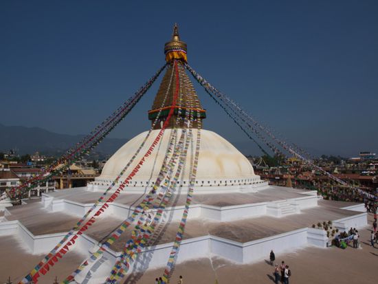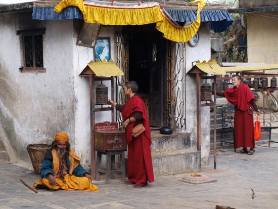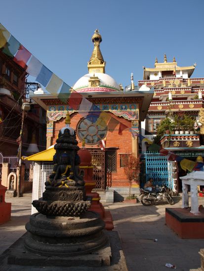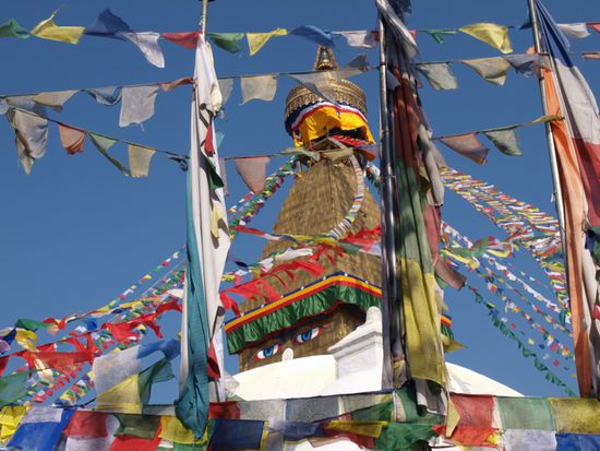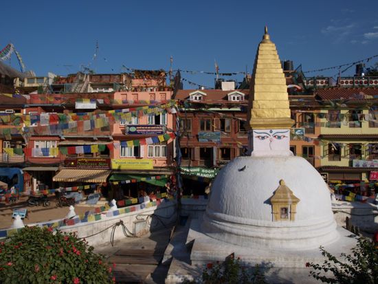 Die Glaeubigen umrunden die Stupa im Uhrzeigersinn und drehen dabei an den Rollen. Die Stupa an sich ist eine komplexe Struktur, die die buddhistische Philosophie repraesentiert. Die 13 Stufen ueber der Kuppel stellen z.B. die 13 Stufen auf dem Weg ins Nirwana dar. Wir haben die Ruhe, den Ausblick auf die Stadt, die besondere Atmosphaere und den steilen Aufstieg ueber unendlich viele Stufen sehr genossen.