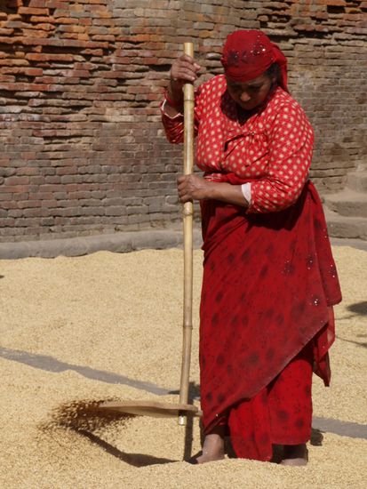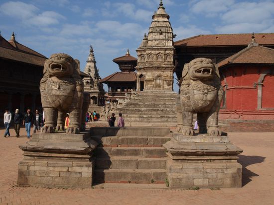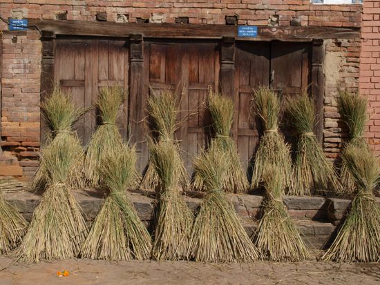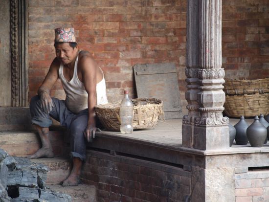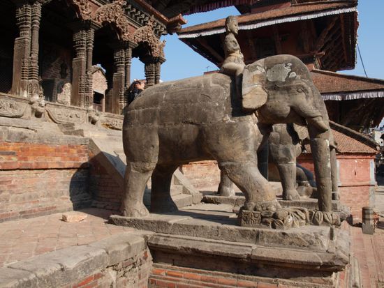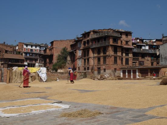 Sehr beeindruckend fanden wir den mit 30 Metern hoechsten Tempel Nepals, der Nyatapola Tempel. Entlang der Treppe hinauf zum Tempel stehen fuenf unterschiedliche, schuetzende Figuren. Jede Figur ist zehnmal so stark wie die Figur auf der Ebene darunter. Schnell lernten wir auch, warum Bhaktapur auch die Reisstadt genannt wird. Auf fast jeder freien Flaeche (Platz, Strassenrand oder Innenhof eines Tempels) wurde Reis getrocknet. Oktober ist der Monat der Reisernte und alles dreht sich fuer die Einwohner um Reis. Ansonsten sahen wir auch in Bhaktapur Tempel, Stupas und das bereits bekannte Gewirr aus Gassen, Hinterhoefen und Verbindungsgaengen.