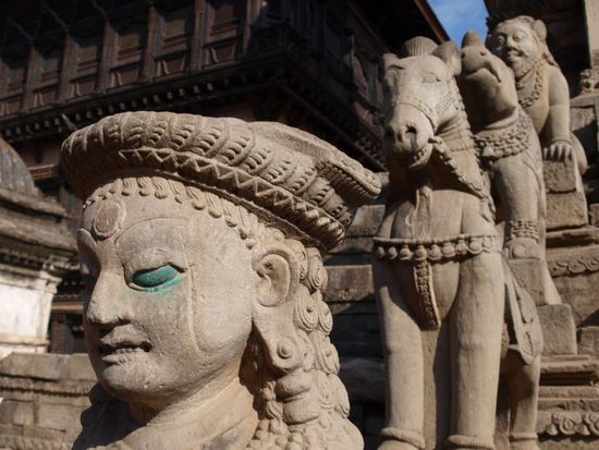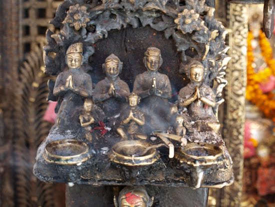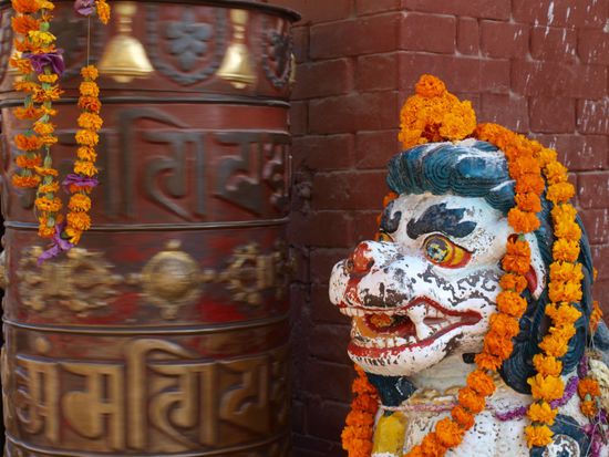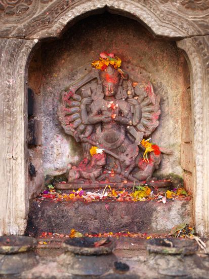 Es ist schwer, eine klare Trennlinie zwischen Hinduismus und Buddhismus in Nepal zu ziehen. Die zwei Religionen sind im Laufe der Zeit in Nepal teilweise verschmolzen. Buddhistische Tempel werden auch von Hindus besucht und neben hinduistischen Tempeln stehen buddhistische Stupas. Die hinduistischen Tempel haben kaum Gemeinsamkeiten mit den Tempeln, die wir in Indien sahen. Ihr Baustil in Pagodenform erinnert eher an chinesisch, buddhistischeTempel bzw. die hinduistischen Tempelanlagen auf Bali. Die beiden grossen Nachbarn Nepals, Indien und China haben das kleine Land stark gepraegt und aus diesen Praegungen hat sich eine sehr charmante und einzigartige eigene Kultur und Religion entwickelt.