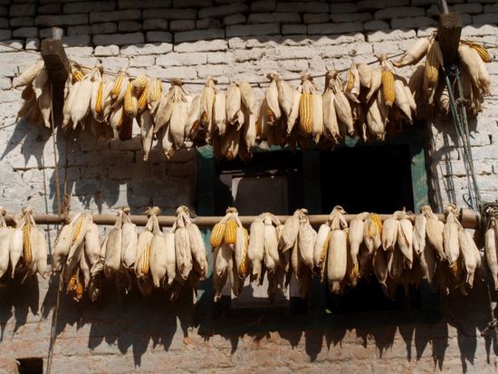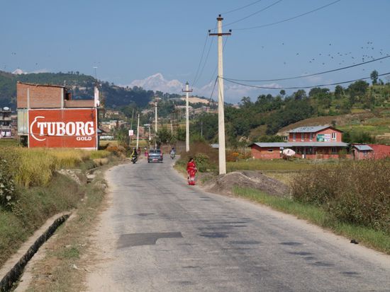 Unser naechstes Ziel Nagarkot erreichten wir mit einem lokalen Bus. Die einstuendige Busfahrt kostete einen Euro fuer zwei Personen. Menschen, die unter Platzangst leiden, sollten lokale Busse in Nepal dringend meiden. Stehend wie sitzend gibt es reichhaltigen und permanenten Koerperkontakt mit den anderen Fahrgaesten. In Nepals Bussen kann man eine interessante lokale Besonderheit beobachten, die wir anderswo noch nicht gesehen haben. Nepalis verstaendigen sich gerne durch heftiges Schlagen auf den Bus mit der flachen Hand. Dies tun sie um einen Haltewunsch zu signalisieren und um dem Fahrer beim Rueckwaertsfahren zu signalisieren, dass er fahren kann oder auch nicht. Zudem wird natuerlich sehr viel gehupt, was aber auch in anderen Laendern beliebt ist. Motorbetriebene Fahrzeuge hupen vor Kurven, vor dem Ueberholen, beim Ueberholen, als Gruss, beim Passieren von Passanten und einfach mal so.