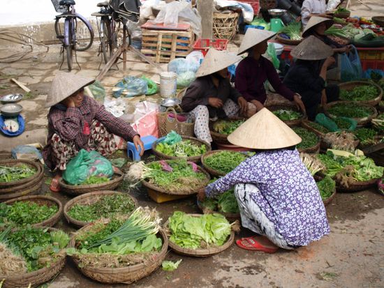 Vormittags liefen wir stundenlang durch die Strassen und Gassen der weitestgehend verkehrsfreien Altstadt und genossen die einzigartige Atmosphaere der Stadt. Oft fuehlte es sich an, als waere die Zeit hier stehengeblieben. Die alten, gelb gestrichenen Gebaeude, Tempel und Versammlungshallen entfuehrten uns in eine laengst vergangene Zeit. Besonders war auch der Markt, der der lokalen Bevoelkerung als Hauptversorgungsquelle dient. Hier dominierten die Frauen im Schlafanzug mit ihren konischen Basthueten das Bild. Zu kaufen gab es saemtliche Felderzeugnisse der Region, Fisch und Fleisch.