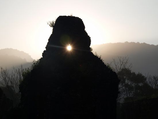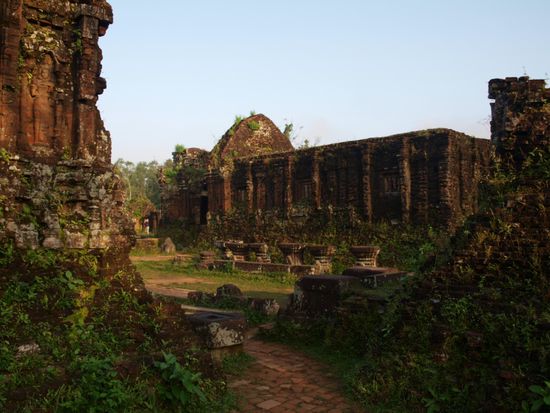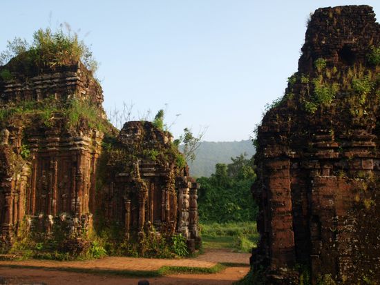 Am naechsten Morgen starteten wir bereits um fuenf Uhr, um den Sonnenaufgang in My Son erleben zu koennen. Dabei handelt es sich um das kulturelle und religioese Zentrum des Champa Koenigreichs. Die Cham bauten hier zwischen dem 4. und dem 13. Jahrhundert Tempel, in denen sie ihre hindusistischen Goetter verehrten. Zwanzig der ehemals mehr als 70 Tempel stehen heute noch auf der Anlage. Die anderen fielen ihrem Alter und zum grossen Teil auch dem Vietnamkrieg zum Opfer. Die Vietkong versteckten sich in dieser Gegend, was My Son zum Ziel amerikanischer Bomben machte. Der Besuch hat sich auf jedenFall gelohnt. Der Sonnenaufgang hinter den Tempeln inmitten des Dschungels war beeindruckend.