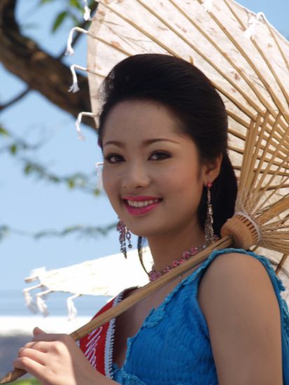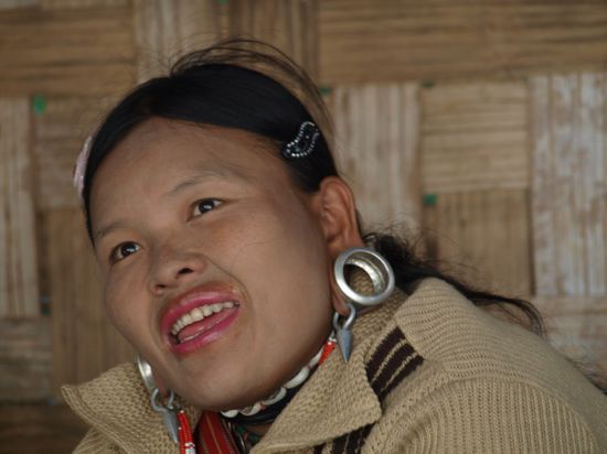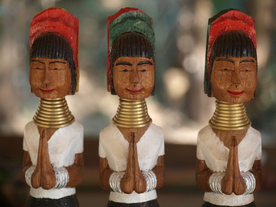 Am naechsten Morgen fuhren wir zu einem Dorf der Padaung. Sie gehoeren zum Volk der Karen und stammen aus Myanmar. Ihre Doerfer liegen eigentlich im suedoestlichen Hochgebirge Myanmars. Dieses Gebiet leidet stark unter der Militaerdiktatur und den Unabhaengigkeitskaempfen verschiedener Volksstaemme.Deshalb floh ein großer Teil der Padaung über die Grenze in den Norden Thailands und wurde von der thailaendischen Regierung in drei Doerfern nahe Mae Hong Sons angesiedelt. Diese Doerfer kann man gegen Gebuehr besuchen und dabei, die wegen ihrer langen, mit Messingreifen geschmueckten Haelse bekannten Giraffen- bzw. Langhalsfrauen und Grossohrfrauen sehen.