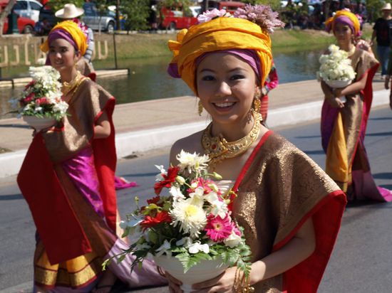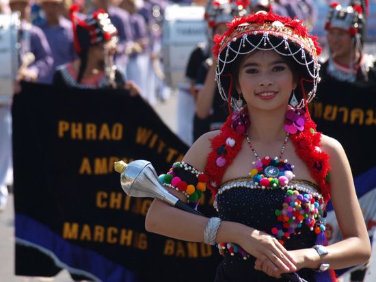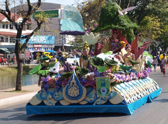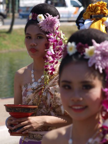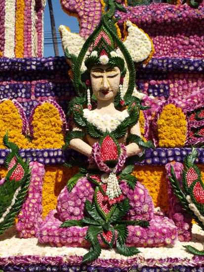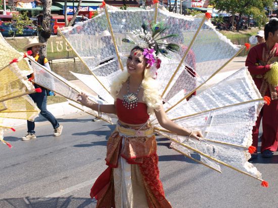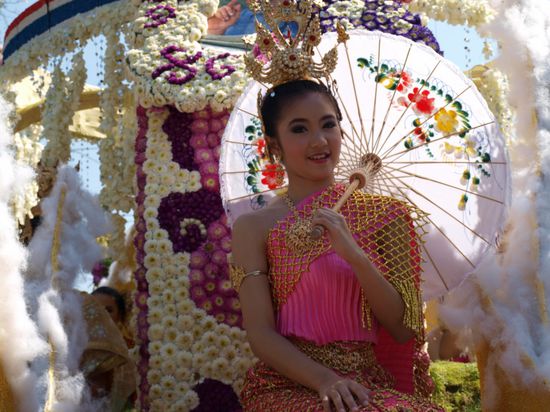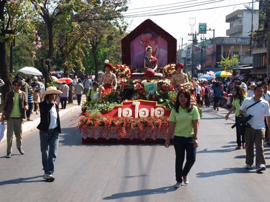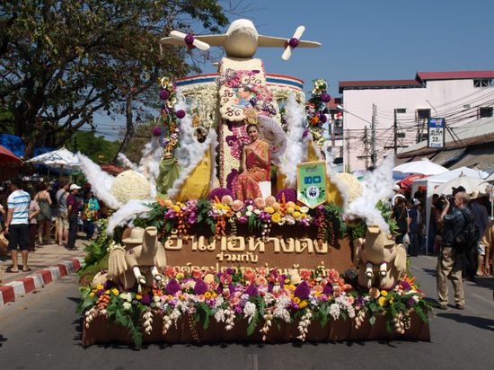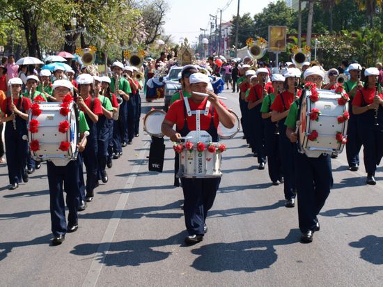 Am Tag nach unserer Ankunft fand die Parade zum jaehrlichen Blumenfestival Chiang Mais statt. Viele Strassen der Innenstadt waren gesperrt und eine lange Parade mit Fussgruppen, Musikern und reichlich verzierten Blumenwagen zog durch die Stadt. Viele Touristen und einheimische Besucher saeumten die Strassen und bewunderten das farbenfrohe Ereignis. Auf den Blumenwagen sassen die Anwaerterinnen zur Wahl der Blumenkoenigin, die am Abend gewaehlt wurde. Spaeter wurden die Paradewagen an einem Park abgestellt und rundherum wurde eine Meile mit Ess- und Souvenirstaenden aufgebaut, auf der bis spaet in die Nacht reger Betrieb herrschte.
