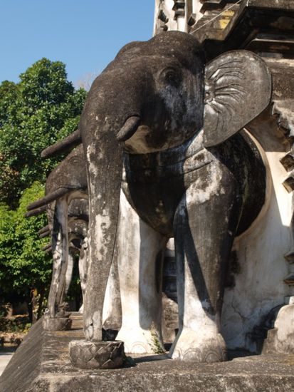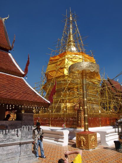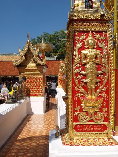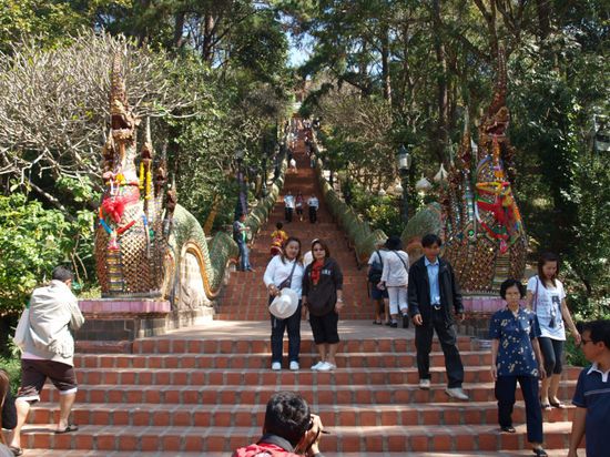 Tags darauf hatte Katja frei und wir konnten gemeinsam die bekanntesten Sehenswuerdigkeiten der Stadt besuchen. Morgens fuhren wir mit einem Sammeltaxi zum Wahrzeichen Chiang Mais, dem Tempel Doi Suthep. Dieses Wat liegt auf einem Berg ueber der Stadt und man erreicht es ueber eine lange Treppe. Das Wat an sich und die Aussicht ueber die Stadt sind einen Besuch wert. Mittags erkundeten wir die Altstadt und besuchten einige Tempel (u.a. Wat Phra Singh, Chedi Luang und Wat Chiang Man). Die Tempel im Norden Thailands unterscheiden sich stark von den Tempeln Bangkoks und im Sueden des Landes. Hier sieht man neben bekannten Elementen viele laotische und burmesische Einfluesse.