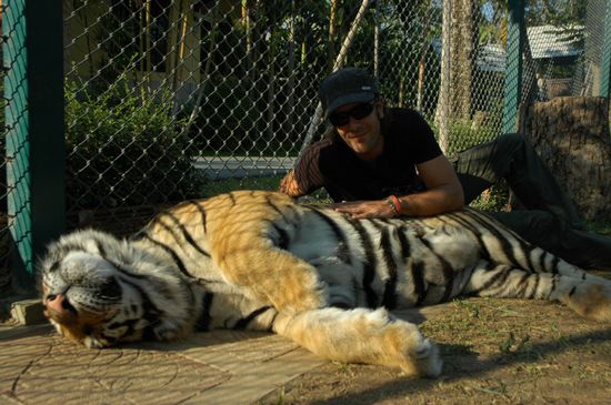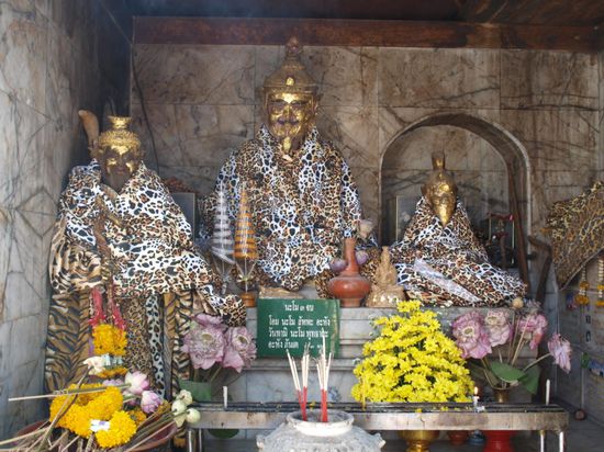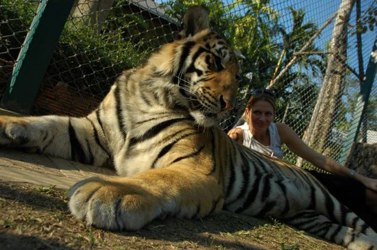 In den naechsten Tagen lernte Katja fleissig weiter und Joerg schaute sich weitere Tempel, das Chinatown und weitere abgelegenere Stadtviertel an. Am letzten Tag besuchten wir gemeinsam das Tiger Kingdom. Dort hat man die Moeglichkeit fuer umgerechnet 6,50 EUR eine Viertelstunde in einem Tigerkaefig zusammen mit zwei ausgewachsenen Tigern zu verbringen. Da uns diese Raubkatzen sehr faszinieren, konnten wir nicht widerstehen und mussten dem Tiger Kingdom einen Besuch abstatten. Anfangs hatten wir grossen Respekt, trauten uns spaeter aber doch naeher an die Tiger heran. Sie waren zum Glueck eher traege und lagen faul in der Sonne. Als dann unerwartet doch eine der Katzen aufstand und ein wenig durch den Kaefig lief waren wir im ersten Moment etwas aufgeregt, stellten aber schnell fest, dass der Gute sich nur ein wenig die Tatzen vertreten wollte und sich nicht auf Futtersuche machte. Fuer uns war es ein unvergessliches Erlebnis, diesen Raubtieren (wenn auch in Gefangenschaft) einmal so nah gewesen zu sein. In freier Wildbahn wuerden wir sie auch sehr gerne mal sehen, dann aber lieber aus etwas groesserer Entfernung.