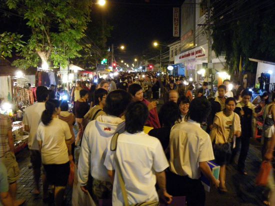 Derartige Abend- bzw.Nachtmaerkte finden in Chiang Mai regelmaessig statt. Es gibt einen taeglichen Nachtmarkt und eine "Samstags- sowie eine Sonntagslaufstrasse". Hierzu wird ein bis zu einem Kilometer langer Strassenabschnitt fuer den Verkehr gesperrt und Haendler bauen dort dann ihre Staende auf.