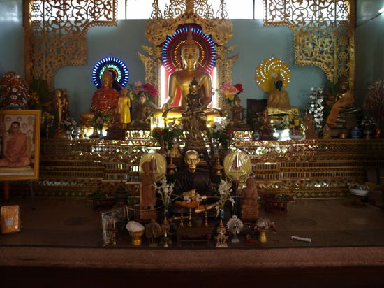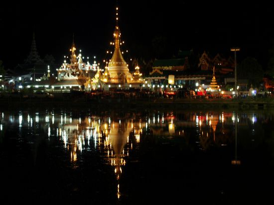 Ein weiterer kurzer Flug mit einer kleinen Propellermaschine brachte uns nach Mae Hong Son. Die Stadt (55.000 Einwohner) liegt sehr idyllisch inmitten einer etwa 1.500 Meter hohen Berglandschaft mit Dschungel und Regenwald. Die Grenze zu Burma/Myanmar ist nicht weit von Mae Hong Son entfernt. Am Nachmittag besuchten wir Wat Chong Kham und Doi Kong Mu. Der erst genannte, im birmanischen Stil erbaute Tempel, liegt an einem kleinen See unmittelbar neben einem anderen Tempel, dem Wat Chong Klang. Besonders lohnt sich der Besuch am Abend, wenn sich die hell erleuchteten Tempel im Wasser spiegeln. Der Tempel Doi Kong Mu liegt auf einem Berg und bietet spektakulaere Ausblicke auf den Ort und die ihn umgebende Berglandschaft.