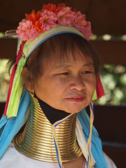 Die ersten Ringe bekommen die Maedchen im Alter von fuenf Jahren von einer Schamanin nach dem Befragen des Horoskops angelegt. An jedem folgenden Geburtstag bekommen sie einen weiteren Ring angelegt. Durch den Druck der Messingringe werden Nackenmuskulatur, Schluesselbeine und Schulterblaetter nach unten gedrueckt. Nach etwa 20 Jahren liegen so bis zu 30 Zentimeter geringeltes Messing zwischen Kopf und Schulter. Die Messingringe wiegen bis zu neun Kilogramm. Je mehr Ringe eine Frau traegt, umso hoeher ist das Ansehen ihrer Familie. Woher dieser Brauch stammt, ist unklar. Es gibt verschiedene Theorien, am anerkanntesten ist die, dass der Koerperschmuck mythologische Hintergruende hat. Die Padaung glauben, dass sie von Drachen abstammen. Durch die Ringe imitieren sie somit die "Haelse" ihrer Vorfahren. Inzwischen stirbt dieser Brauch allmaehlich aus. Viele Maedchen tragen zwar noch Ringe, aber nur so viele, dass die Schultern nicht nach unten gedrueckt werden.