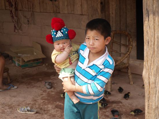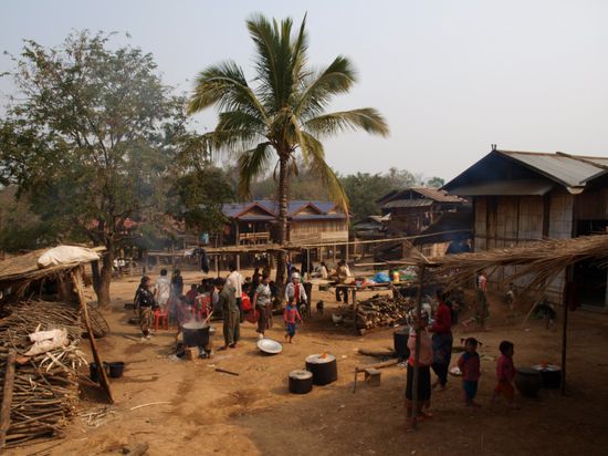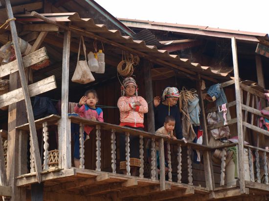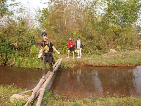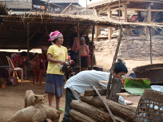 Die Wanderung mit Chris und Isabel hat sich gelohnt. Wir sind vier Stunden gewandert, haben Melonenfelder, Zuckerrohrfelder, Yao- und Akhadoerfer besucht. Wir hatten Glueck, in einem Dorf die Vorbereitungen fuer eine am Abend stattfindende Hochzeit zu sehen. Das ganze Dorf war auf den Beinen und viele der Frauen trugen fuer diesen Anlass ihre traditionellen Trachten. Insgesamt waren die Doerfer wesentlich uespruenglicher als im Norden Thailands. Einige waren nur zu Fuss ueber kleine Feldwege erreichbar.