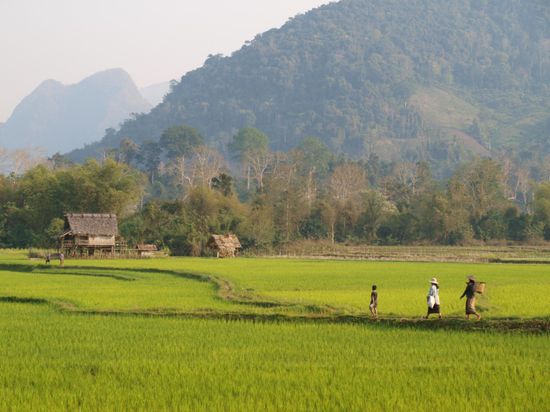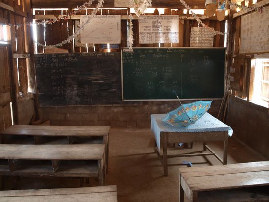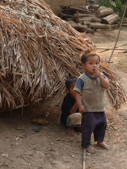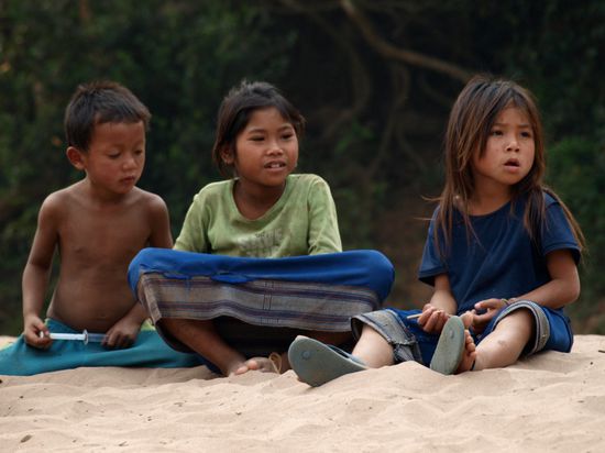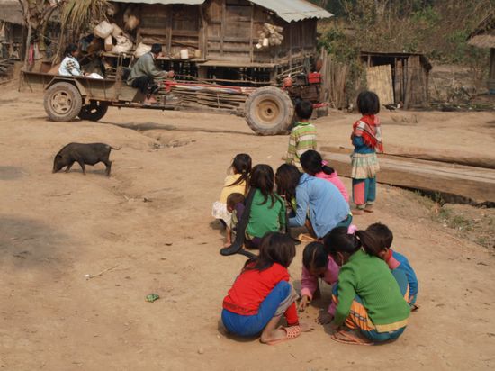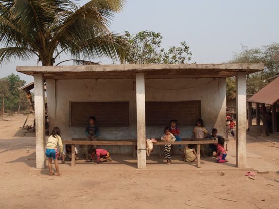 Die Demokratische Volksrepublik Laos ist der einzige Binnenstaat in Suedostasien. Bis 1949 war Laos eine franzoesiche Kolonie und ist seitdem selbststaendig. Es ist eins der aermsten Laender der Welt. Laos grenzt an China, Vietnam, Kambodscha, Thailand und Myanmar und hat sechs Millionen Einwohner. Die Hauptstadt und groesste Stadt ist Vientiane. Die Hauptglaubensrichtung in Laos ist der Theravada-Buddhismus. Ahnenkult und Animismus sind vor allem in der Bevoelkerung der Gebirgsregionen verbreitet. Laos hat eine sehr niedrige Alphabetisierungsrate. Nur zwei Drittel der Maenner und ein Drittel der Frauen ueber 15 Jahren koennen lesen und schreiben. Fast 40 % der Laoten haben noch nie eine Schule besucht, in manchen Provinzen sind es mehr als 60 %. Zwei Drittel der laotischen Kinder brechen vorzeitig die Grundschule ab, um zum Lebensunterhalt der Familie etwas beitragen zu koennen, insbesondere in der Feldarbeit.